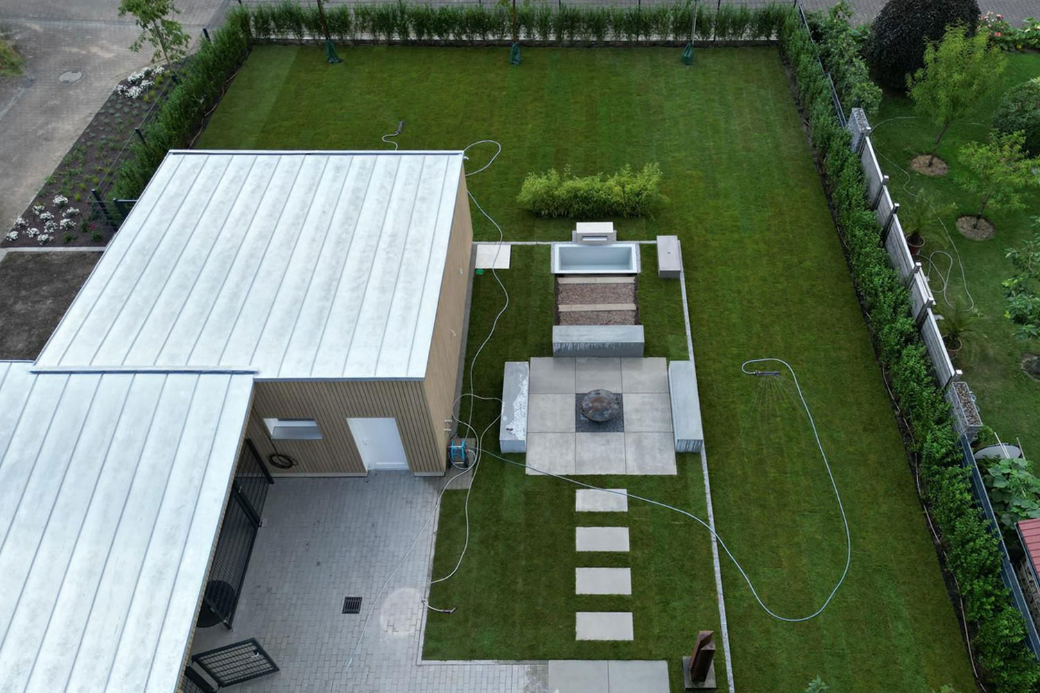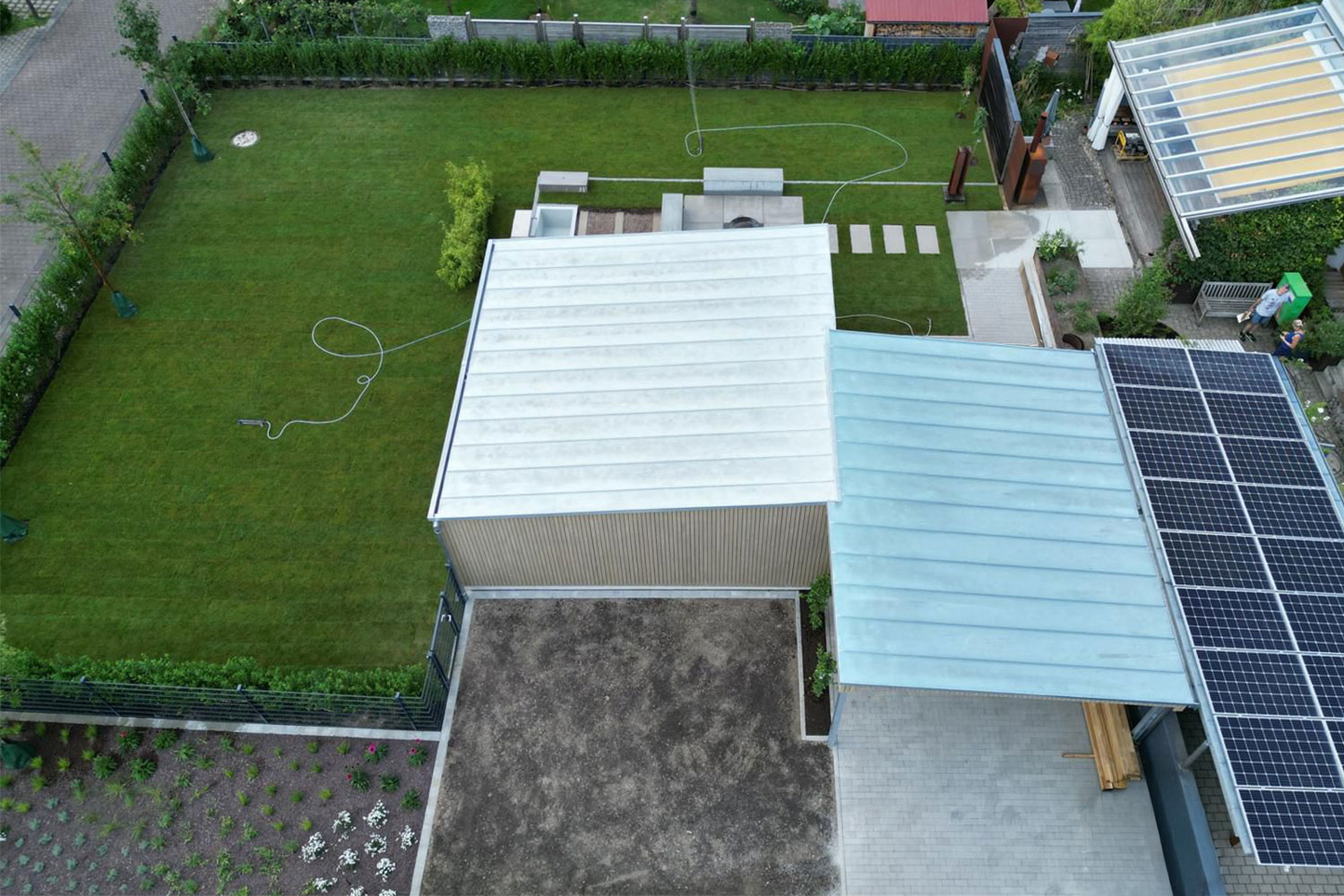 Dieses Projekt umfasst die Erweiterung eines bestehenden Wohnhauses durch einen großzügig angelegten Garten mit Wasserbecken und Feuerstelle. Gleichzeitig wurde Platz für einen neuen Schuppen geschaffen, der als Lagerfläche dient und die Basis für einen großen Carport bildet. Der Schuppen wurde optisch an den bestehenden Carport angebunden, wodurch eine harmonische Verbindung zwischen Alt- und Neubau entsteht.